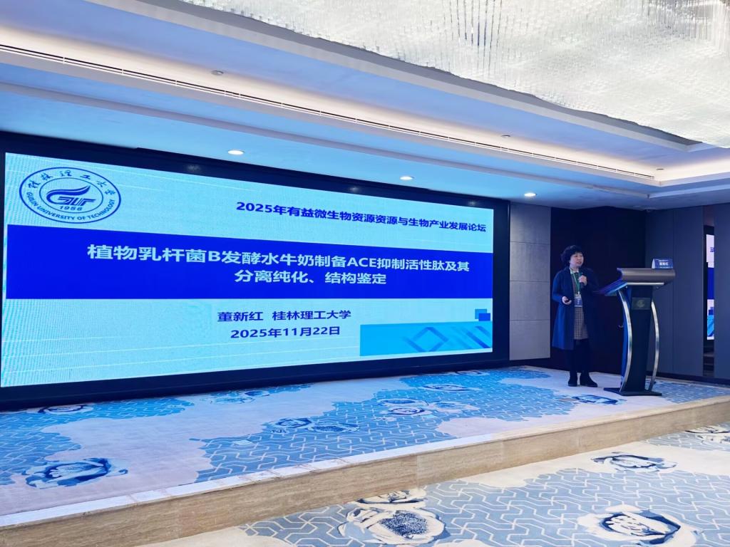 会上,董新红教授作《植物乳杆菌发酵水牛奶制备ACE抑制活性肽及其结构研究》分会报告,展示团队在功能活性肽开发领域的研究成果。李静副研究员作《五指毛桃内生菌分离筛选与活性研究》报告,介绍团队在特色资源微生物挖掘与活性利用方向的工作。两位研究生在研究生论坛进行学术汇报,体现了我院青年科研力量在相关领域的探索与积累。