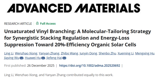 近日,我院化学与生物工程学院海杰峰教授与东华大学胡华伟教授、香港科技大学(广州)吴佳莹教授团队合作,在有机太阳能电池(OSCs)非富勒烯受体材料设计与光伏性能提升领域取得重要进展。研究成果以“Unsaturated Vinyl Branching: A Molecular-Tailoring Strategy for Synergistic Stacking Regulation and Energy-Loss Suppression toward 20%-Efficiency Organic Solar Cells”为题,在国际材料科学顶级期刊《Advanced Materials》(影响因子28.6)上发表。我校为该论文的第一完成单位,硕士研究生张焱焱为共同第一作者,海杰峰教授为第一通讯作者。