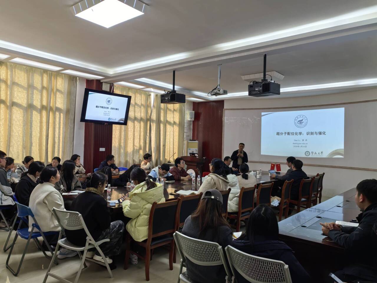 报告现场座无虚席。在交流环节,李丹教授与在场师生围绕超分子化学领域的前沿问题展开了深入讨论。本次高水平学术报告有效促进了我校与兄弟院校的学术对话与合作,为相关学科的平台建设与科研创新提供了有益支撑。 整场活动学术氛围浓厚,有效拓宽了师生的科研视野,激发了创新思考。