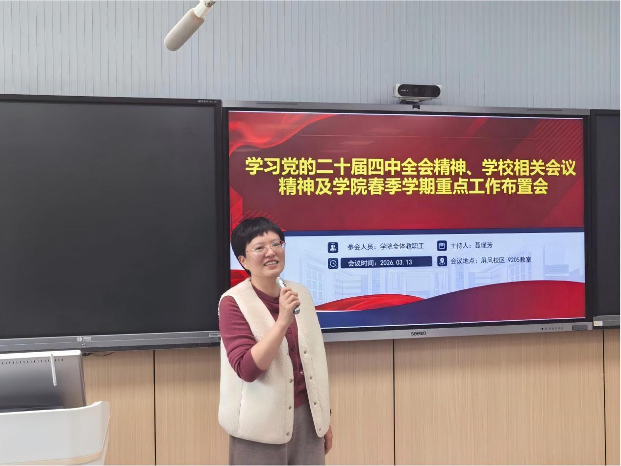 学院院长聂瑾芳组织学习了党的二十届四中全会精神。她指出,全院上下要将学习贯彻全会精神同落实学校第四次党代会精神紧密结合起来,同学校“十五五”发展的谋篇布局深度衔接,同新学期各项工作的开篇起步一体推进,切实把学习成效转化为强党性、铸忠诚、抓落实、促发展的具体实践。随后,传达了学校近期召开的春季学期工作会议及相关专题会议精神,强调要紧紧围绕学校确定的年度目标任务,主动担当,积极作为。在部署学院春季学期重点工作时,她要求,必须坚持以高质量党建引领学院事业高质量发展,紧紧围绕立德树人根本任务,系统谋划、统筹推进博士点申报、一流专业建设、高水平科研成果培育、高层次人才引育等核心工作。她号召全体教职工迅速收心归位,进一步凝心聚力,以更加饱满的热情和更加扎实的作风,全身心投入新学期的各项工作,共同奋力谱写学院发展的新篇章。