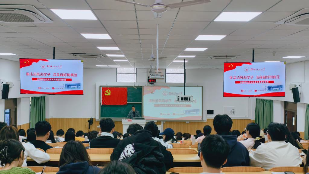 为深入学习贯彻习近平新时代中国特色社会主义思想,持续推动党风廉政建设工作不断向纵深发展,扎实做好“清廉化生”建设工作。11月28日,学院在雁山校区05314教室开展了主题为“廉洁清风诲学子,洁身自好树典范”的廉洁教育专题党课。本次党课由学院纪委委员黄道坤老师主讲,学院120余名学生党员参加本次专题党课活动。